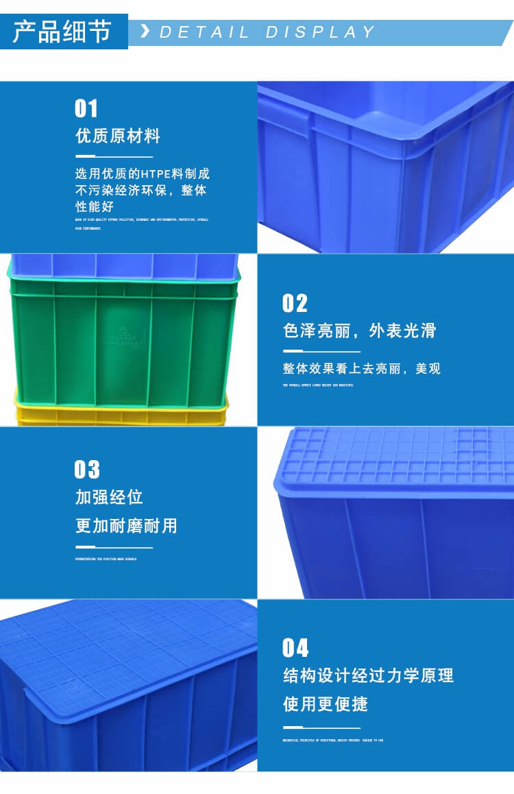 塑料周轉箱適用于服裝、五金、機械、電子、化工、儀表、養(yǎng)殖業(yè)、食品、水產、物流倉儲等行業(yè),可用于盛放食品,清潔方便,零件周轉便捷、堆放整齊,便于管理。其合理的設計,優(yōu)良的品質,適用于工廠物流中的運輸、配送、儲存、流通加工等環(huán)節(jié)。
